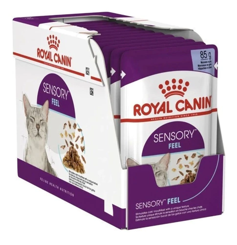 Durante las comidas, la sensación de diferentes texturas en la boca de tu gato tiene un gran efecto en su experiencia cuando se alimenta. Esta característica sensorial, conocida como sensación bucal, conlleva la detección de una amplia gama de estímulos físicos dentro de la boca. Implica toda la interacción física y química de un alimento con la boca, desde el primer bocado y la percepción inicial en el paladar, hasta la masticación y el acto final de la deglución. En otras palabras, para los gatos, comer es una experiencia táctil tanto o más que una experiencia gustativa. Por eso, SENSORY™ Feel de Royal Canin mejora la sensación bucal, estimula aún más los sentidos de tu gato y, al mismo tiempo, ofrece novedad y enriquecimiento a sus comidas. Sus fórmulas están elaboradas con texturas únicas de salsa y gelatina, que son más cremosas y tienen una cobertura más suave que durará más tiempo en la boca de tu gato. Esta textura única también incluye bocaditos más fibrosos parecidos a los trocitos de carne cortados a mano, que tanto atraen a los gatos y les proporcionan variedad de texturas cuando se alimentan